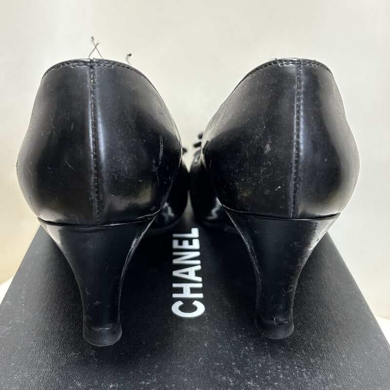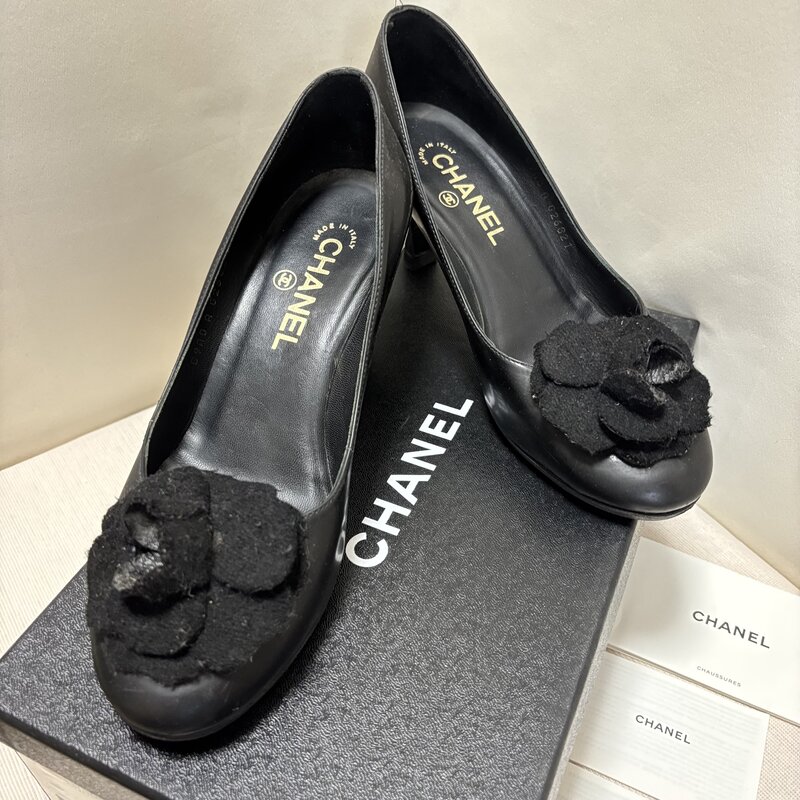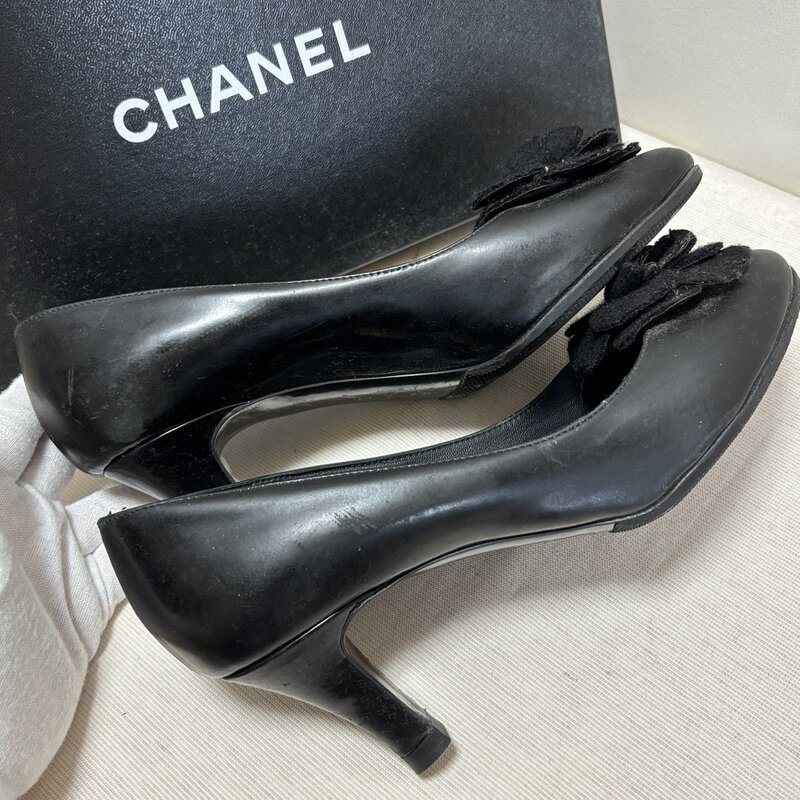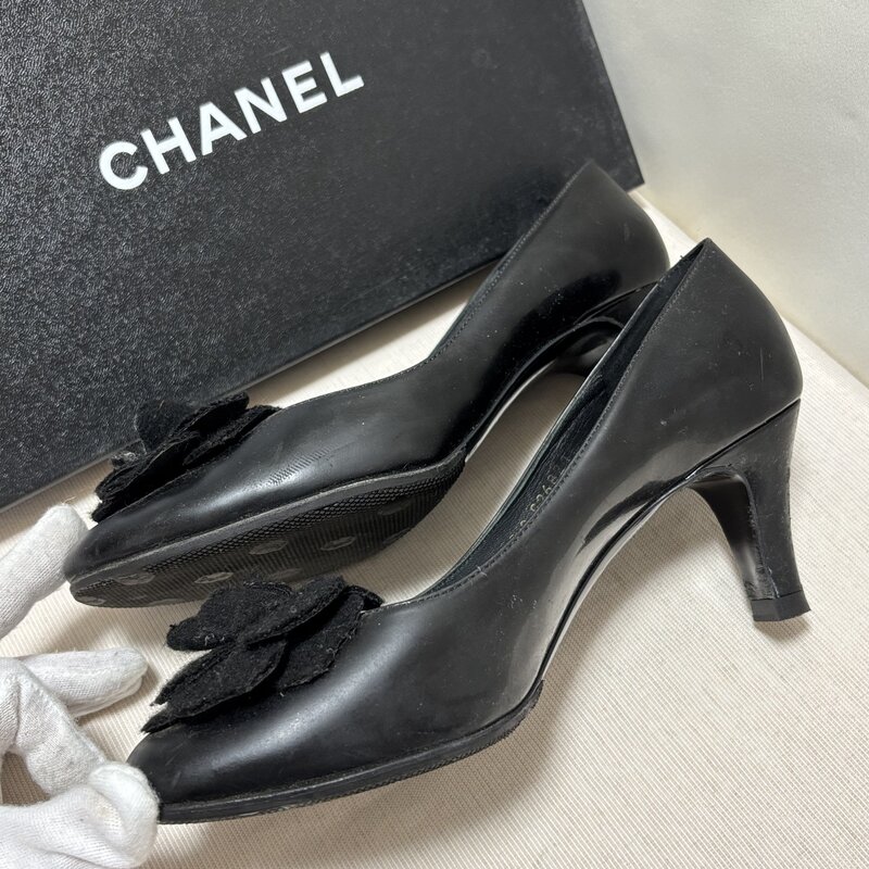 箱入 中古 CHANEL シャネル カメリア 花 フラワー パンプス ヒール 37 1/2 ココマーク IW512BS01CHN80