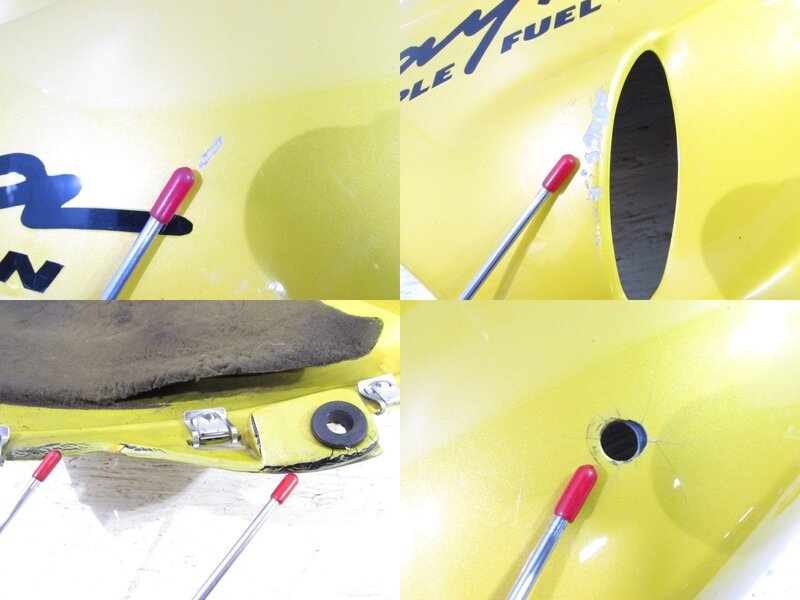 【外装】 ☆タンク・・・程度良好!! 特に気になるような破損はなく、艶も御座います! 樹脂製となりますのでタンク内見える範囲に特に気になるような錆は見られません! 商品状態良好です! 一部傷が御座います! ☆スクリーン・・・社外製のカラースクリーンになります! 特に気になるような破損は御座いません! 比較的状態の良い商品となります! ☆アッパーカウル・・・程度良好!! 特に気になるような破損はなく、艶も御座います! 商品状態良好です! 一部傷が御座います! ☆アッパーサイドカウル・・・左右共に特に目立った破損はなく、艶も御座います! 一部傷やひび割れが見られます! ☆アンダーカウル・・・特に大きな破損はなく、艶も御座います! 一部マフラー熱による変形やチジミ割れ等御座います! ☆Fフェンダー・・・程度良好!! 特に気になるような破損はなく、艶も御座います! 一部塗装剥げが御座いますが比較的状態の良い商品となります! ☆フレームカバー・・・左右共に特に気になるような破損はなく、艶も御座います! 一部傷が御座います! カーボン調になります! ☆シングルシートカウル・・・割れや欠け等御座います! 補修ベースにご活用ください! ☆テールカウル・・・特に大きな破損はなく、艶も御座います! 一部ひび割れや欠けが御座います! ☆シート・・・特に目立った破損は御座いません! フチに一部軽度の小破れが御座います!