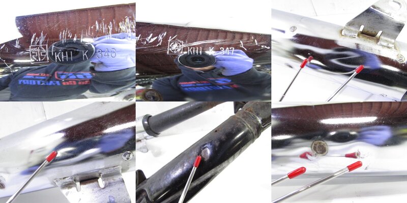 【足回り】 ☆フロントフォーク・・・目視で曲がりもなく、外観特に気になるような破損は御座いません!取り外し前に数回ボトムをさせてみましたが特に気になるようなOIL滲みは見られました! ダストブーツにひび割れが出てきております! ☆スイングアーム・・・目視にて曲がりもなく、外観特に気になるような破損は御座いません!シャフトなどのSETとなります! ☆リアサスペンション・・・目視で曲がりも無く、外観特に気になるような破損は御座いません! リンク付きとなります! ☆ホイール・・・前後共に目視で曲がりもなく、スムーズに回転しておりました! ☆タイヤ・・・前後共に実働車より取り外しており、特に気になるような目立ったひび割れは見られず残り溝もまだまだ御座います!