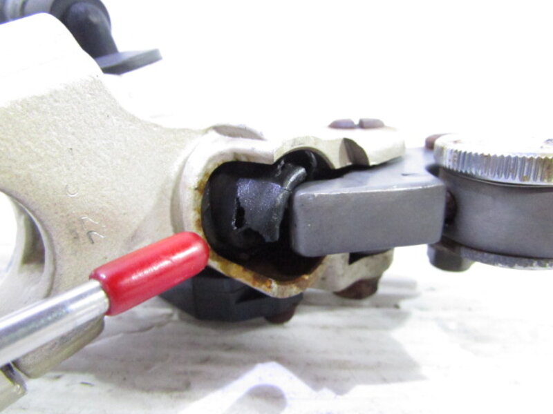 ☆フロントフォーク・・・目視で曲がりもなく、外観特に気になるような破損は御座いません!取り外し前に数回ボトムをさせてみましたところOIL漏れが見られました! ダストブーツに破れが出てきております!
