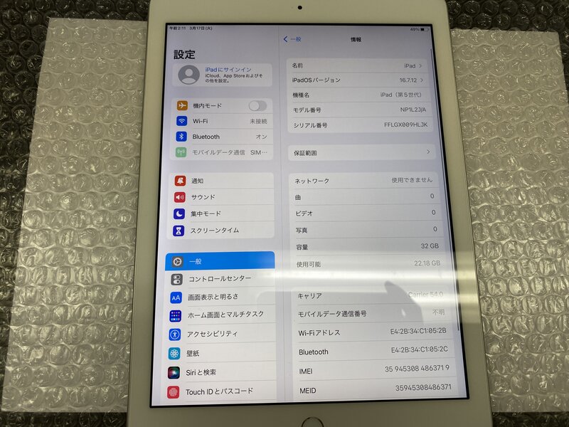 EZ729 SIMフリー iPad 第5世代 Wi-Fi+Cellular A1823 シルバー 32GB