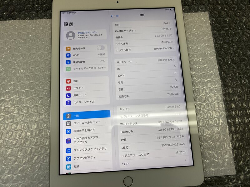 EZ733 SIMフリー iPad 第6世代 Wi-Fi+Cellular A1954 シルバー 32GB