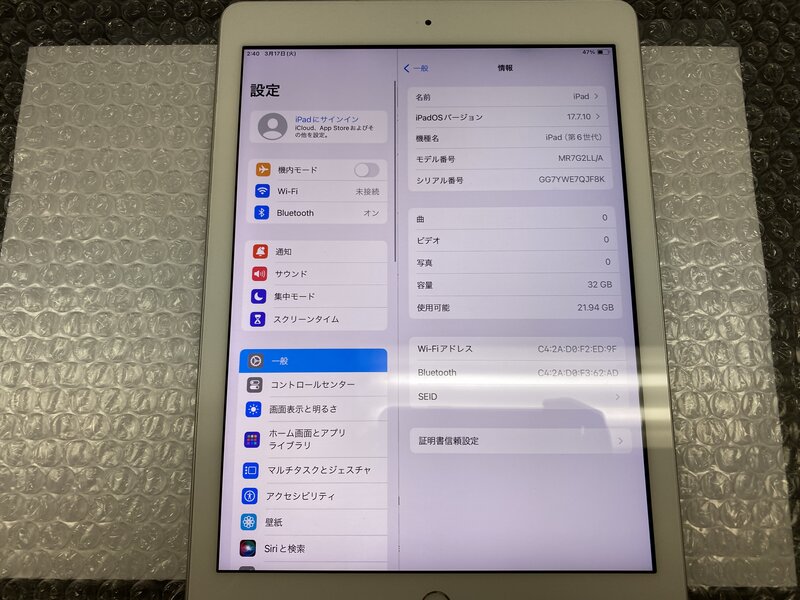 EZ734 iPad 第6世代 Wi-Fiモデル A1893 シルバー 32GB