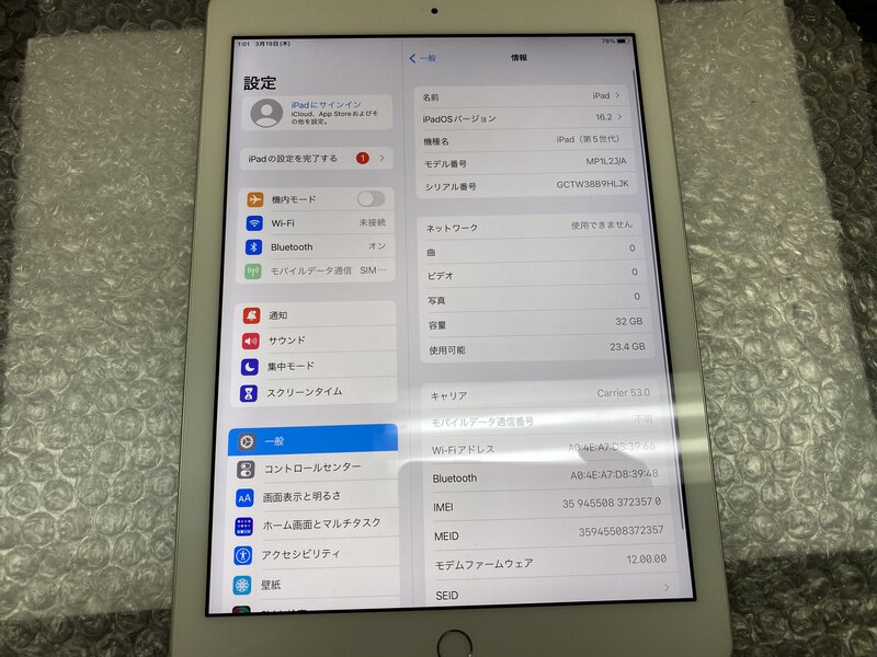 OA026 SIMフリー iPad 第5世代 Wi-Fi+Cellular A1823 シルバー 32GB