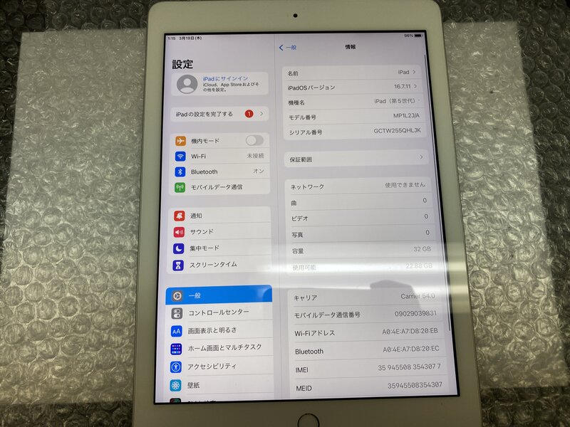 OA032 SIMフリー iPad 第5世代 Wi-Fi+Cellular A1823 シルバー 32GB