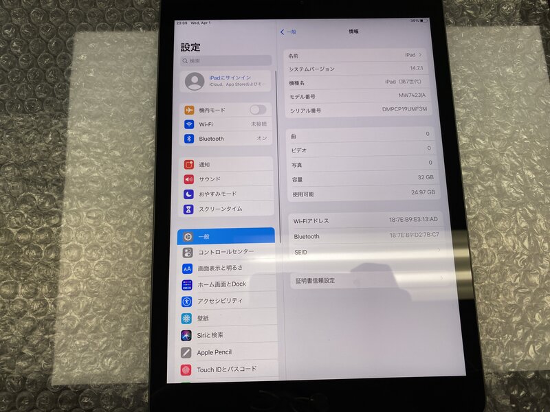 OB226 iPad 第7世代 Wi-Fiモデル A2197 スペースグレイ 32GB