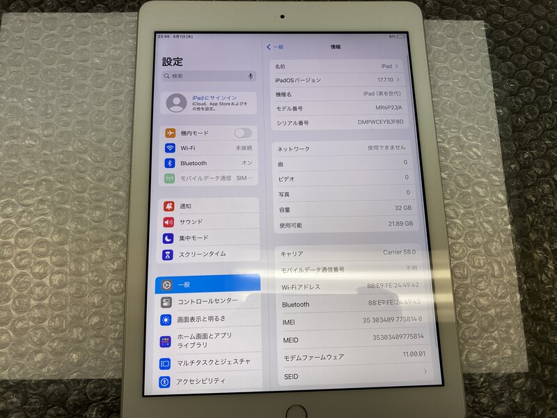 OB237 SIMフリー iPad 第6世代 Wi-Fi+Cellular A1954 シルバー 32GB