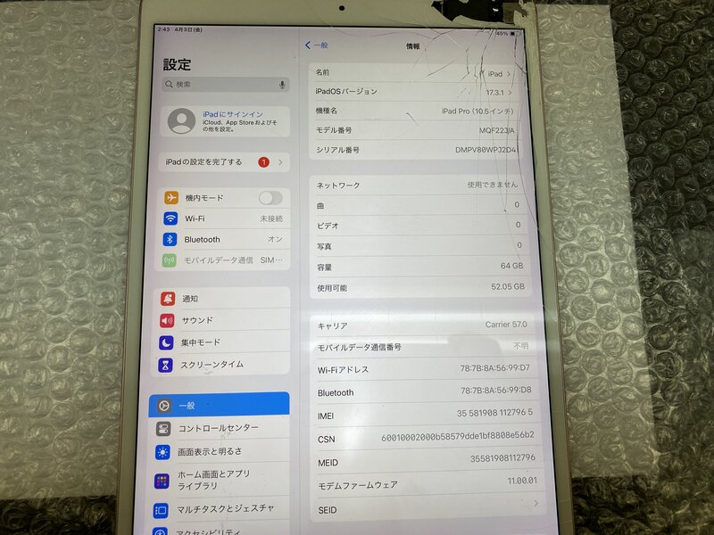 アクティベーションロック・・・OFF 画面割れ・光漏れ